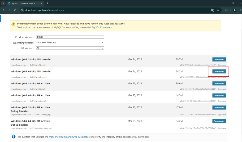 MySQL Serverが8.0.39なので、それに近しい8.0.33を選択しました。