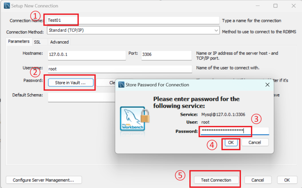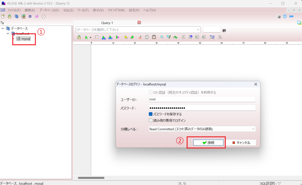 ホスト名やポート番号やユーザIDは、Workbench側を変更していなければそのまま。