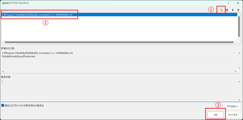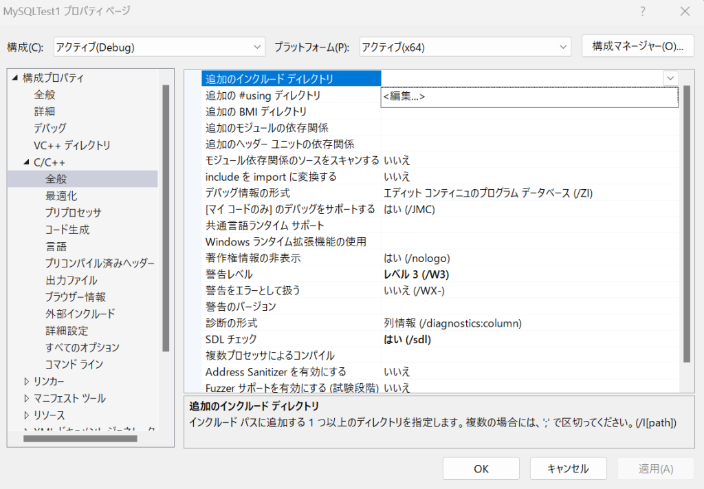 MySQL Connector C++のincludeディレクトリパスを追加します。