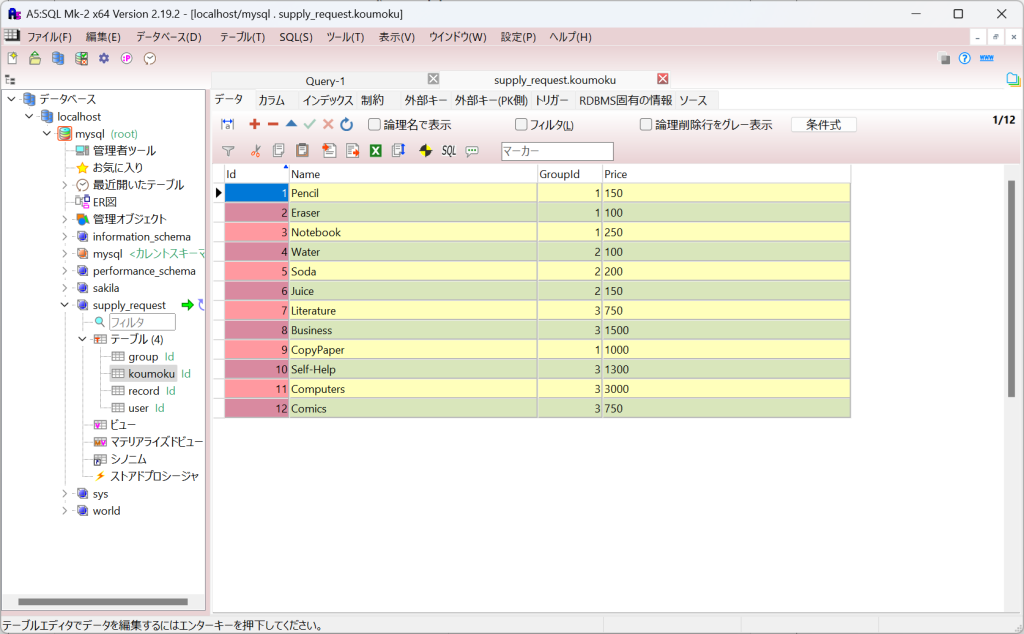 項目はグループIDが1のデータが表示されるし。
