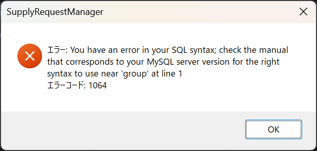 const sql::SQLString TABLE_GROUP = "`group`";テーブル名をバッククォートで囲みました。