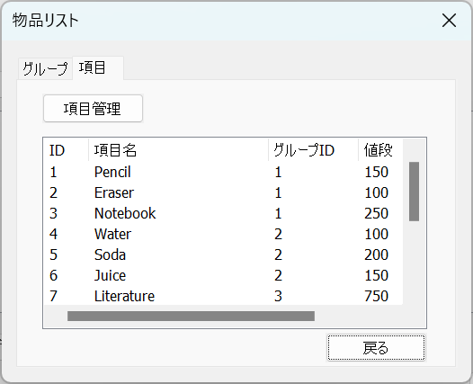 一つの画面で「グループ」と「項目」の2種類を表示させたいため、