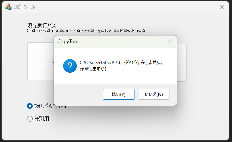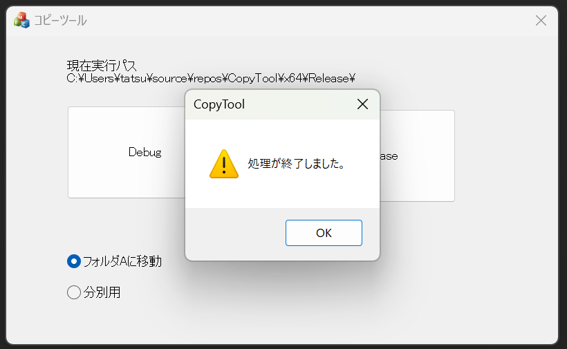 今回からは「C:\Users\tatsu\source\repos\CopyTool\x64\Debug」の中のexeを開きます。