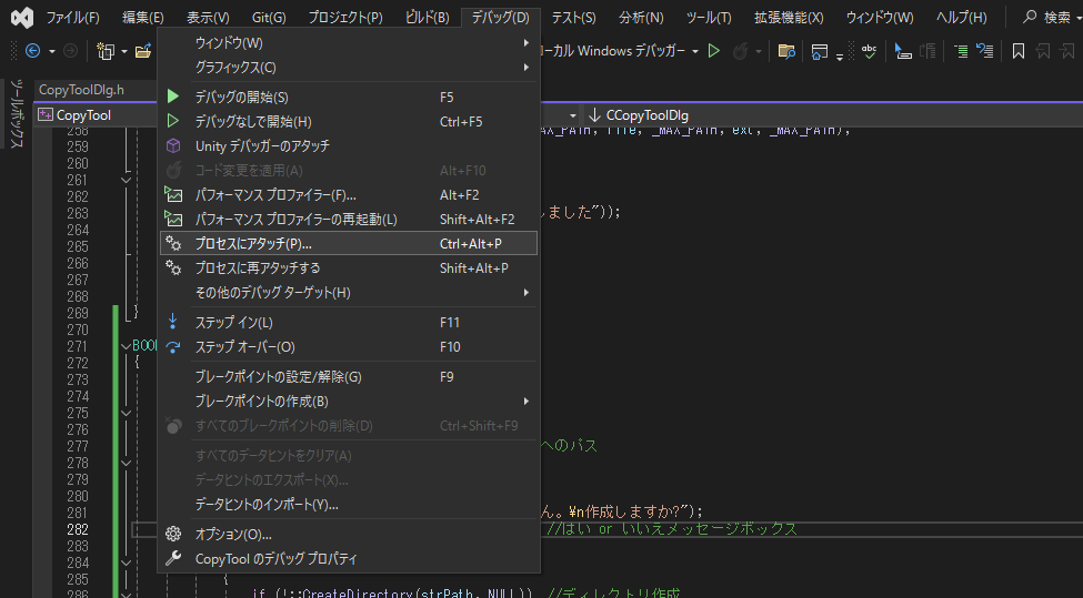 さて、Visual Studioの「デバッグ」→「プロセスにアタッチ」を選択します。