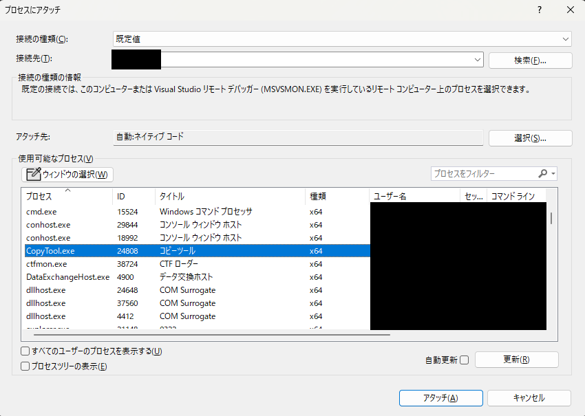 そして起動している「CopyTool.exe」を選択し、アタッチします。