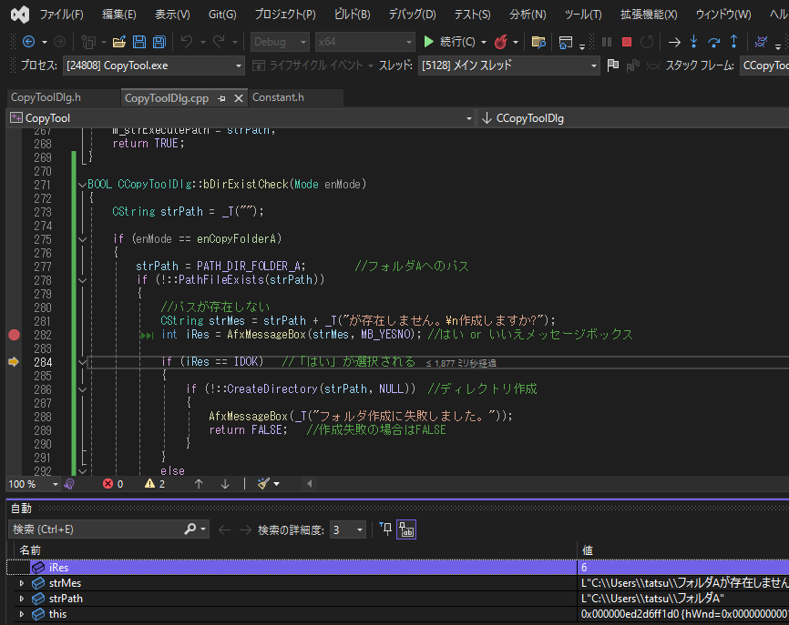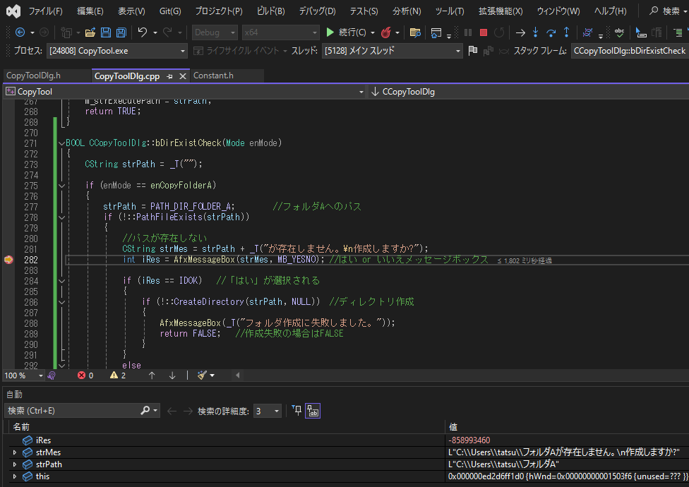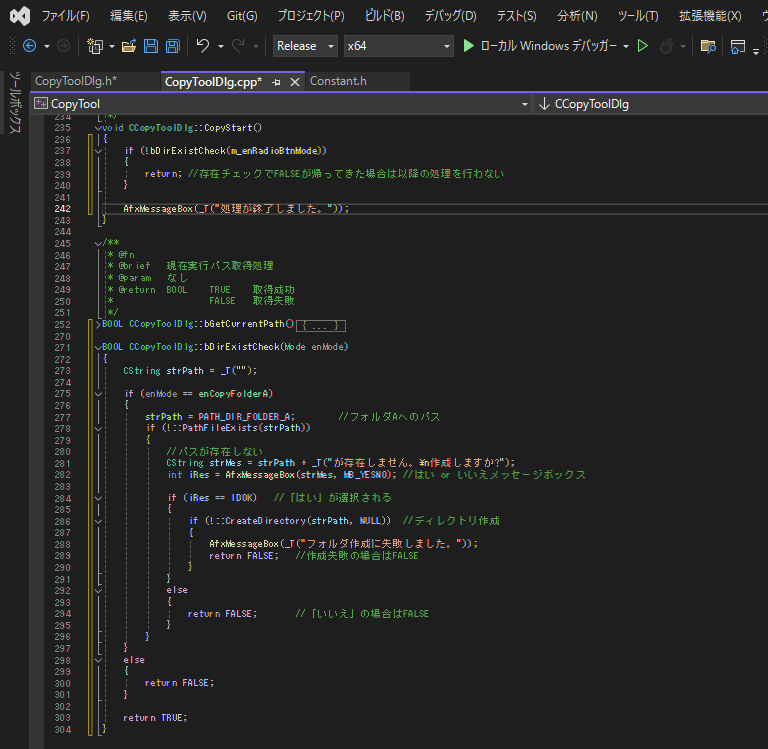 BOOL bDirExistCheck(Mode enMode);CopyToolDlg.cppに関数処理を書きます。