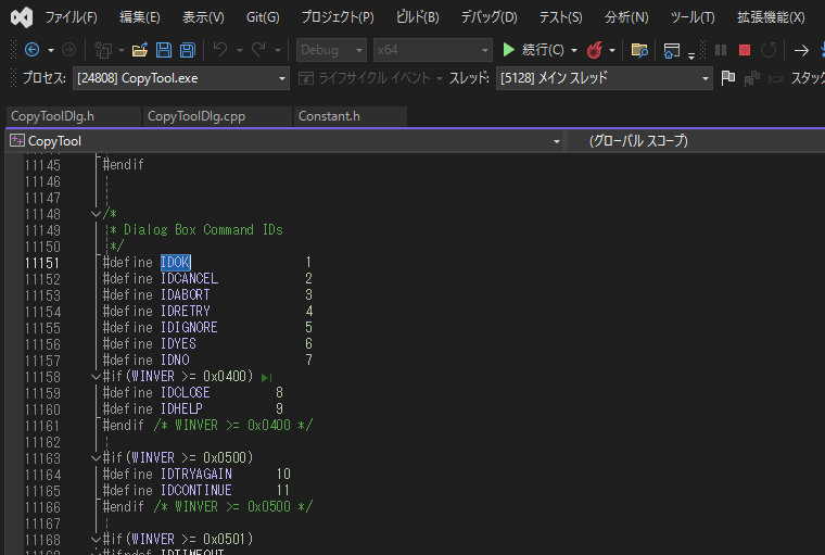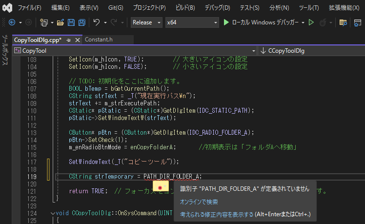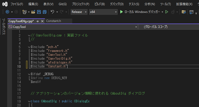 ただし、この状態でこの定数をCopyToolDlg.cppで使用した場合、コンパイルエラーになります。