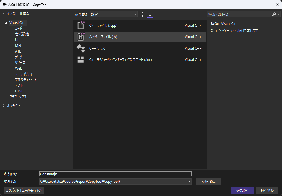 「ヘッダーファイル(.h)」を選択し、名前をConstant.hに変えて追加ボタン。