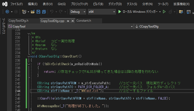 もう一つ、共通処理CopyStart()の一番最後に、メッセージボックスを出しておきます。