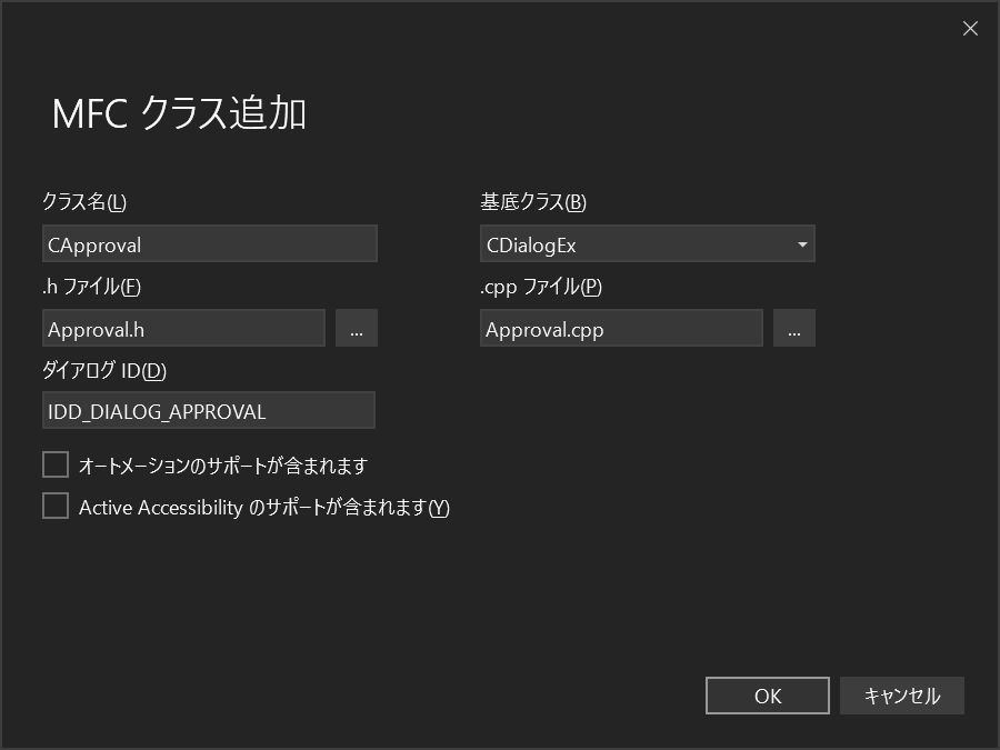 デフォルトだとクラスがCAboutDlgになっているので、CApprovalに変更します。