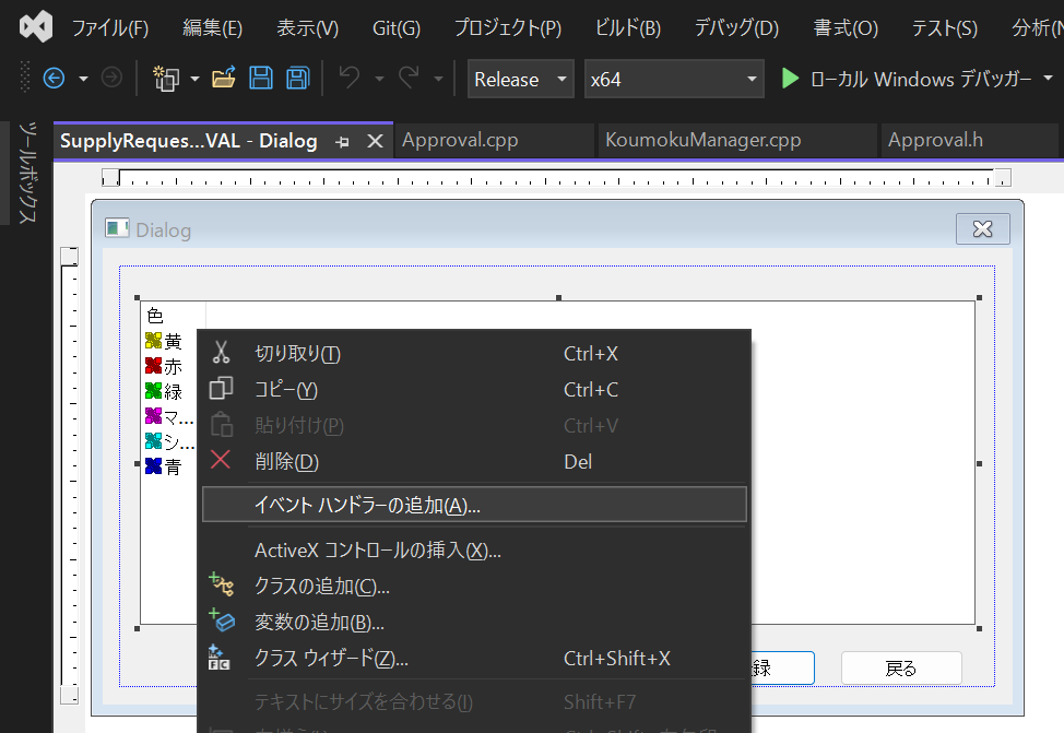 afx_msg void OnNMClickListApproval(NMHDR* pNMHDR, LRESULT* pResult);動作処理作成