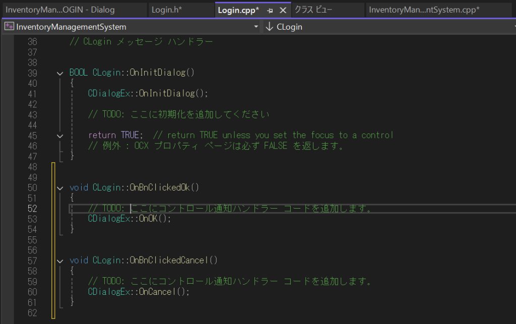 OK(ログイン)ボタンが押された時に呼ばれる関数OnBnClickedOkに処理を書きます。