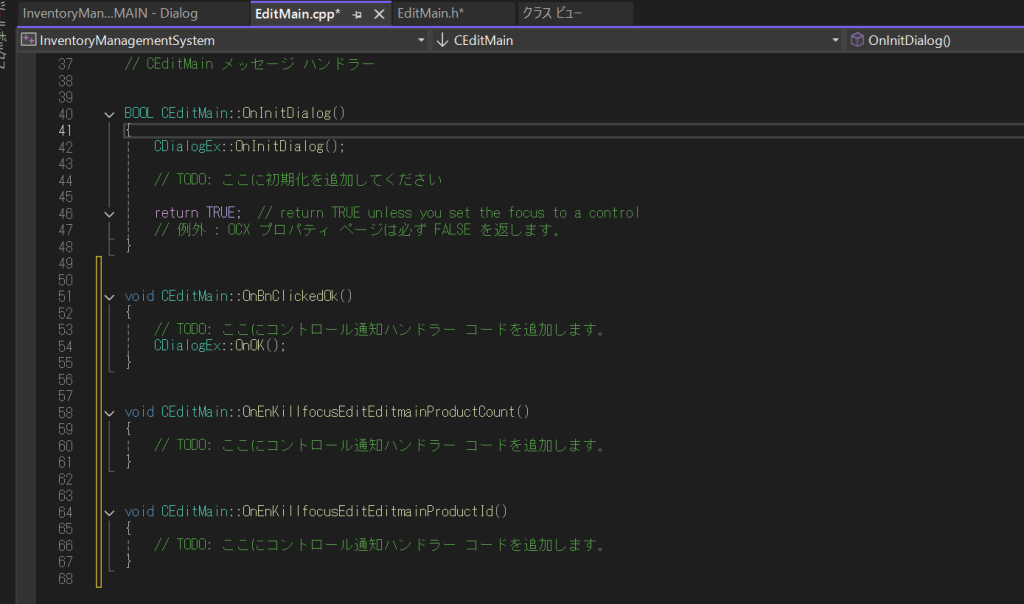 該当ボタンをダブルクリックするとOnBnClickedOkが出来上がります。