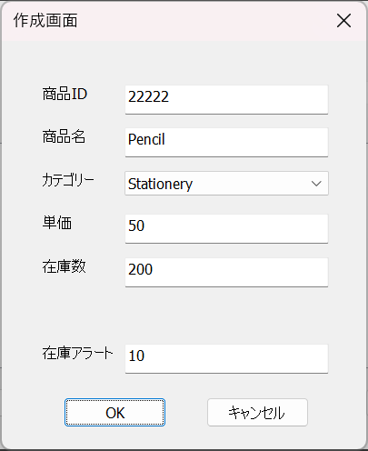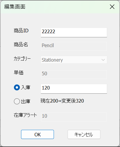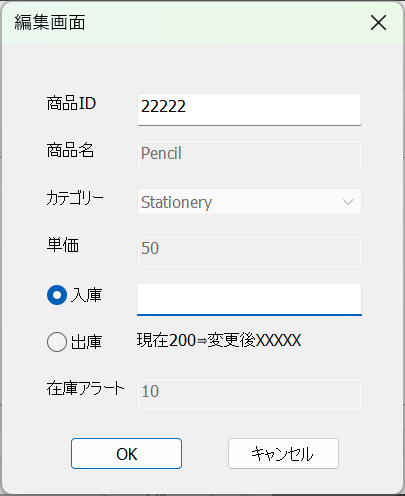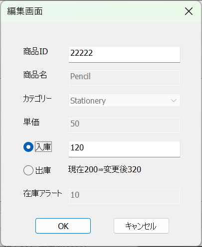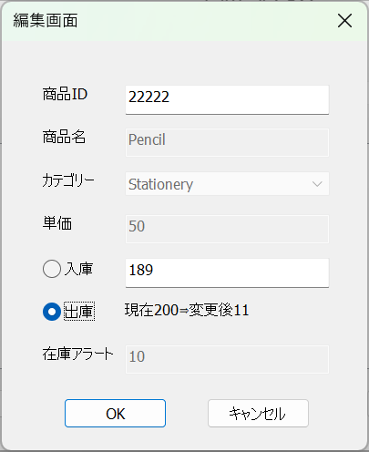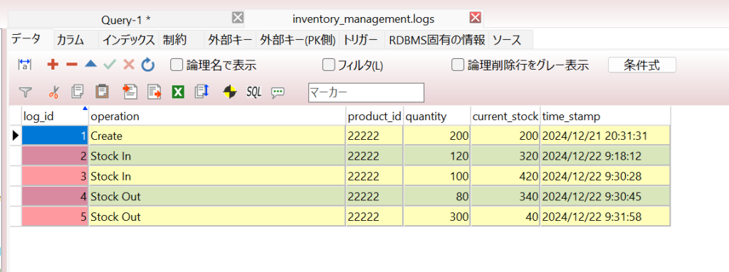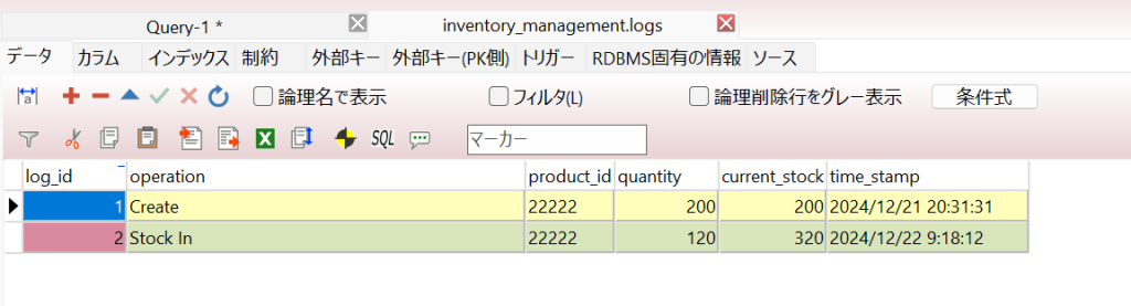 BOOL bLogTableInsert(CString strProductID, CString strOperation, CString strQuantity = _T("0"), CString strCurrentStock = _T("0"));引数を増やしました。