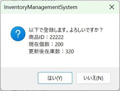 strMessage.Format(_T("以下で登録します。よろしいですか?\r\n商品ID:%s\r\n現在個数:%s\r\n更新後在庫数:%d"),