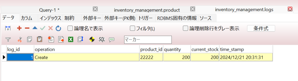 BOOL CMySQLManager::bLogTableInsert(CString strProductID, CString strOperation, CString strQuantity, CString strCurrentStock)