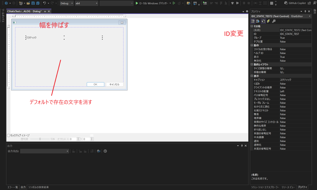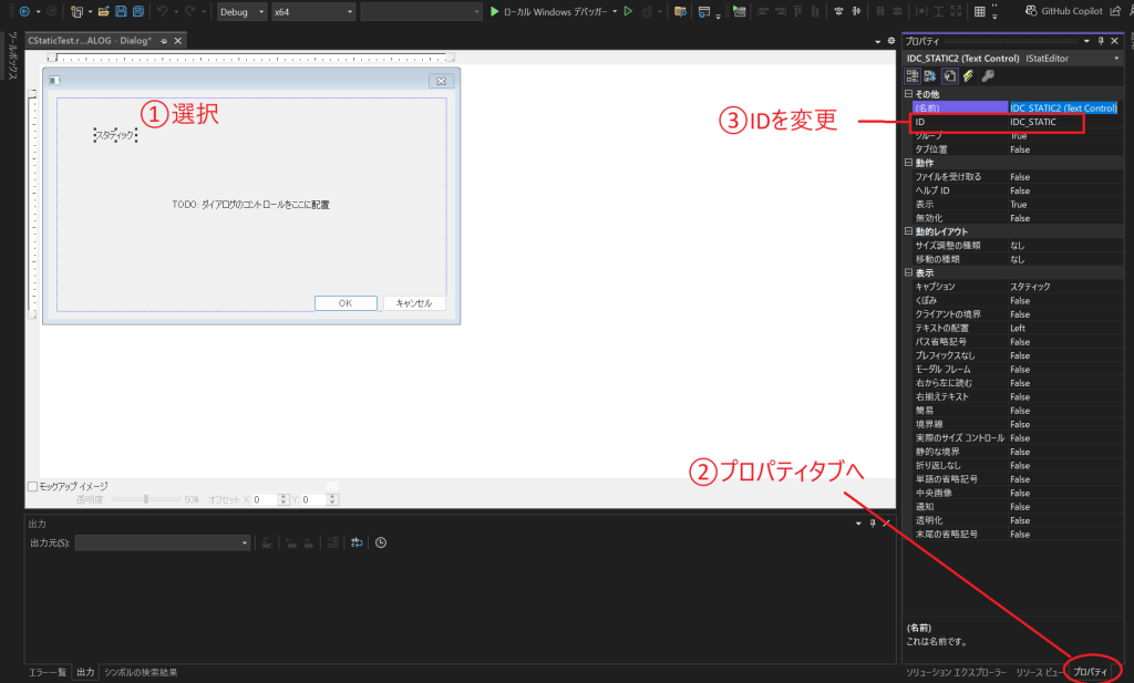 今回は、ID名をIDC_STATIC_TESTに変更します。