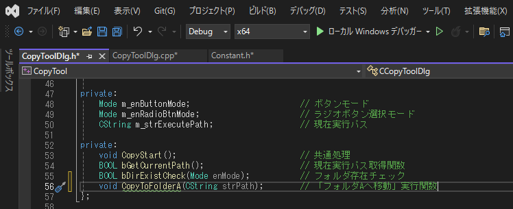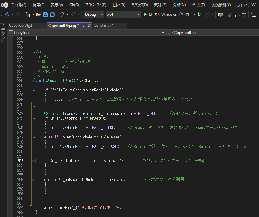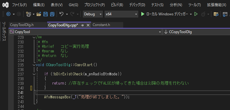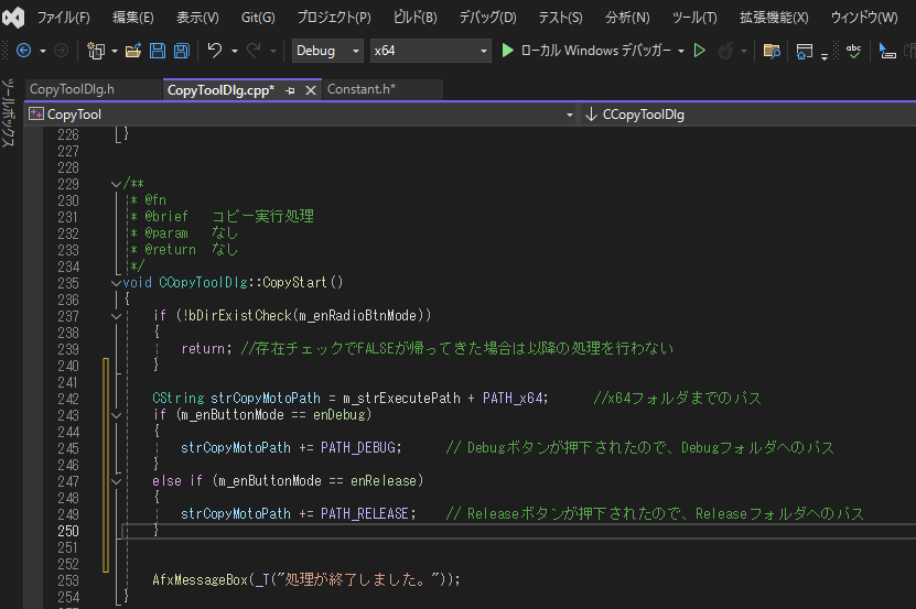CopyToolDlg.cppの開き、CopyStart関数を少しいじります。