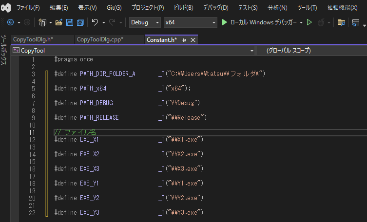 なので、x64フォルダは_T(“x64”)で定義しています。
