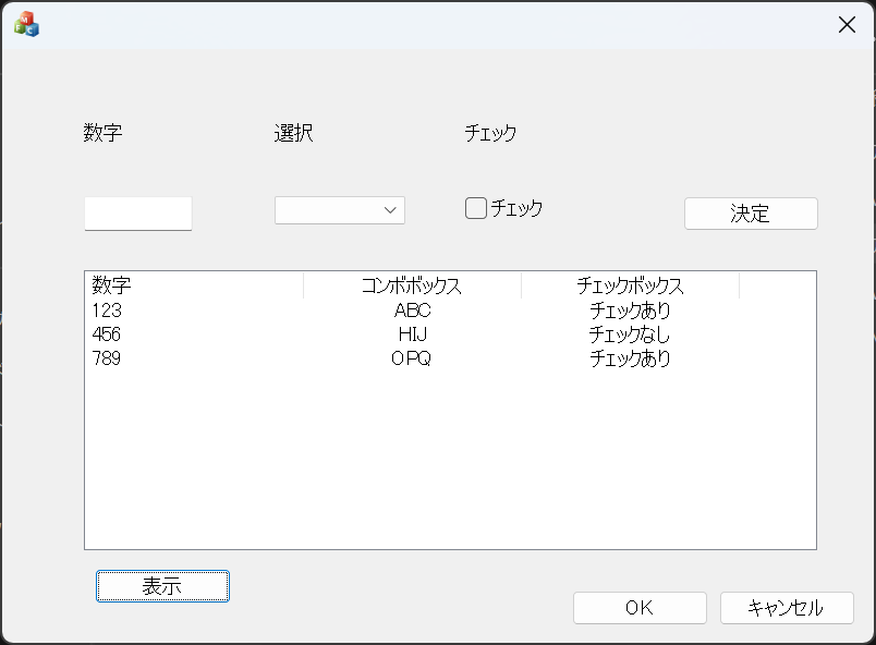 画面上の各コントロール(エディット、コンボ、チェック)に入力された内容を一つの「オブジェクト」としてまとめ、それをリスト構造で保持・表示するプログラムです。