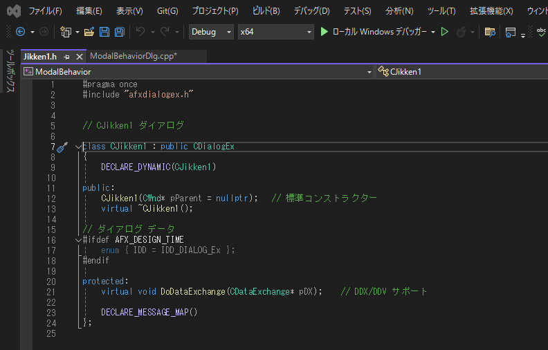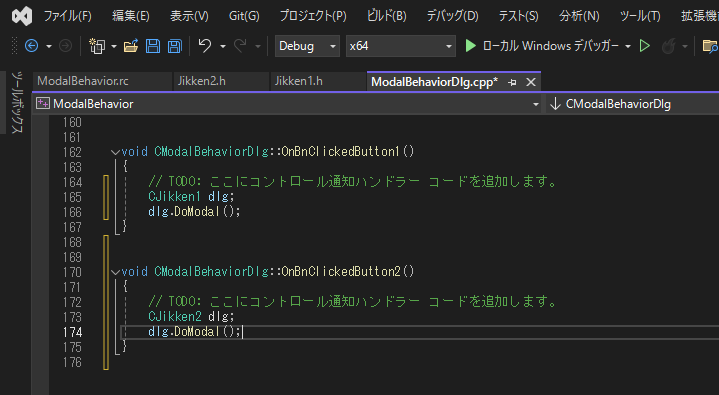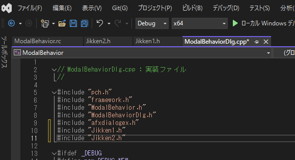 最後にModalBehaviorDlg.cppに戻って、作成したヘッダーを2つインクルードします。