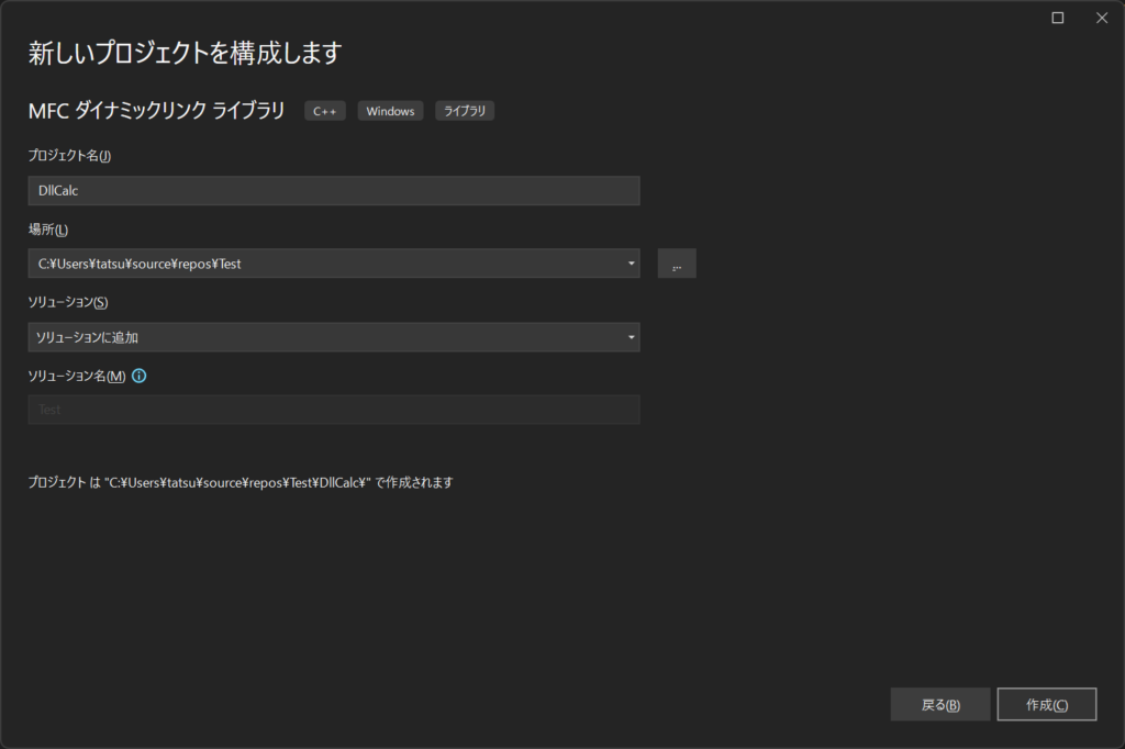 次へを選択し、プロジェクト名は「DllCalc」にでもしておきます。