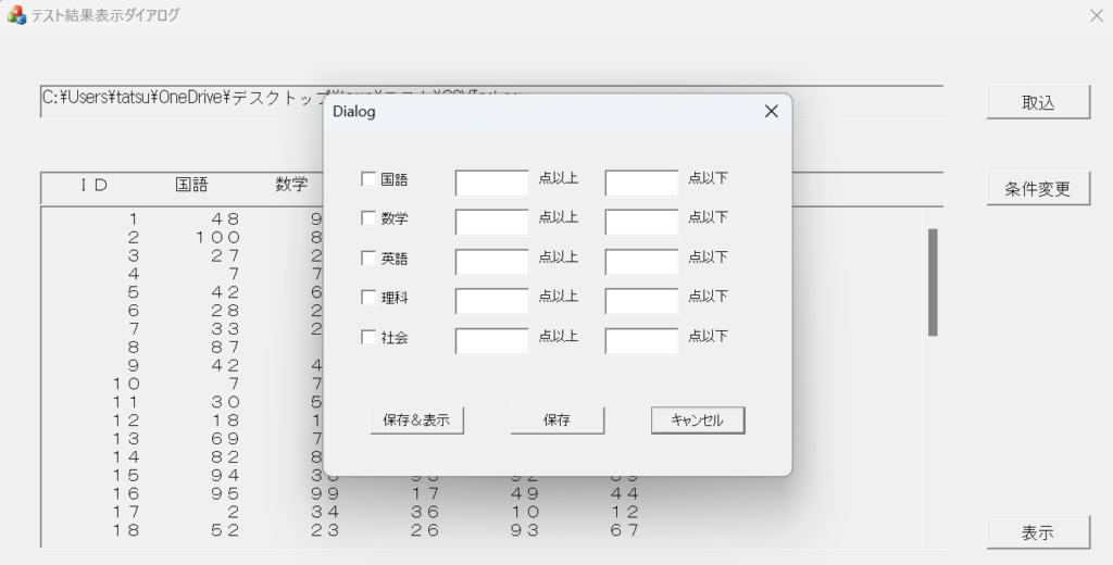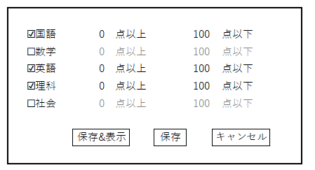 どの列を表示するか、どの項目がどの点以上か、などです。
