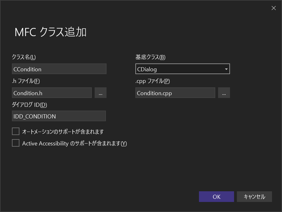 MFCクラス追加画面が出てくるので、