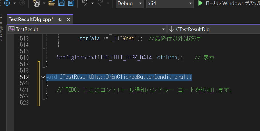 TestResultDlgの方に関してはボタン処理を追加しただけなのでそこだけ。